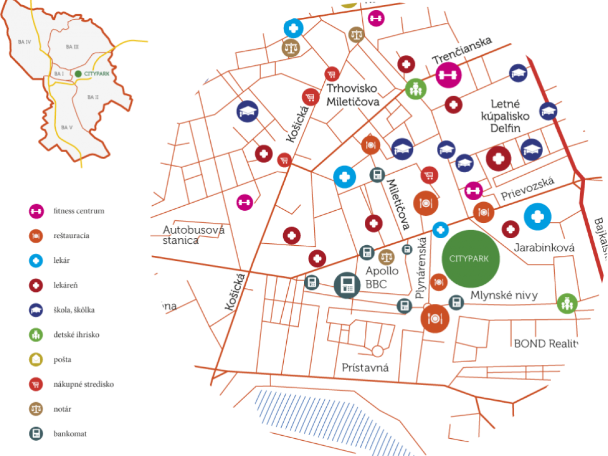 CityPark Ružinov je výborne dostupná lokalita s rýchlym napojením do centra mesta aj na diaľnicu. V bezprostrednom okolí sa nachádza všetko potrebné pre pohodlný mestský život.