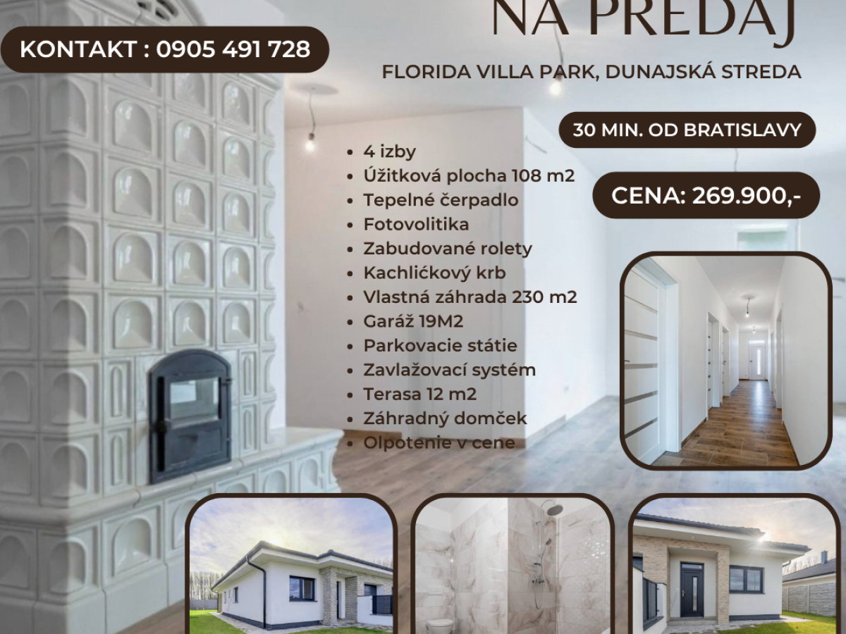 Moderný 4-izbový dvojdom v Dunajskej Strede – Pripravený k okamžitému nasťahovaniu Objavte svoj nový domov v pokojnej štvrti Florida Villa Park v Dunajskej Strede! Tento moderný 4-izbový rodinný dvojdom s garážou je ideálnou voľbou pre rodiny, ktoré hľadajú komfort, priestor a moderné technológie. Kľúčové vlastnosti: • Úžitková plocha 108 m² a pozemok s rozlohou 400 m² so zavlažovacím systémom. • Energetická trieda A s tepelným čerpadlom pre nízke prevádzkové náklady. • Elektrické rolety na diaľkové ovládanie. • Priestranná terasa (20 m²) a úložný priestor v podkroví (20 m²). • Záhradný domček na uskladnenie náradia. Lokalita: Dvojdom sa nachádza v tichej časti Dunajskej Stredy s výbornou dostupnosťou na rýchlostnú cestu R7, vďaka ktorej ste v Bratislave len za 30 minút. V blízkom okolí nájdete všetko, čo potrebujete pre plnohodnotný život: termálne kúpalisko, nákupné centrá, reštaurácie a športoviská. Cena domu s krbom je 269 900 €. Pre viac informácií a obhliadku nás neváhajte kontaktovať.
