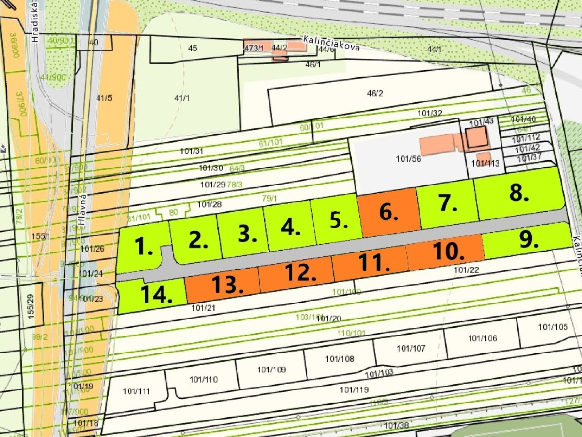 🟧 Oranžovou farbou sú vyznačené rezervované pozemky.