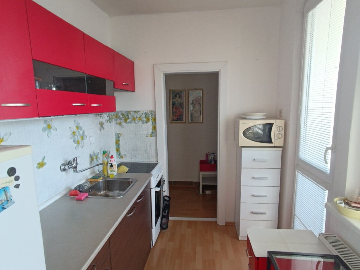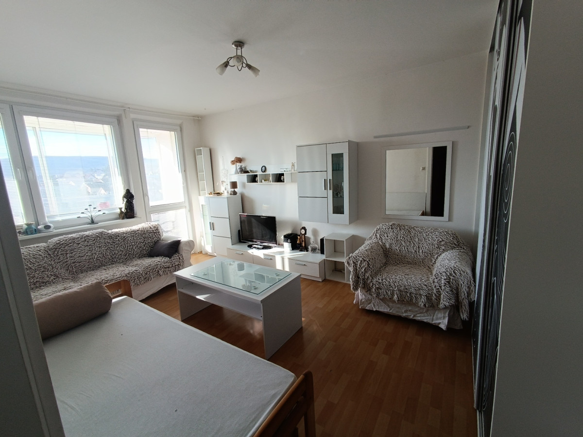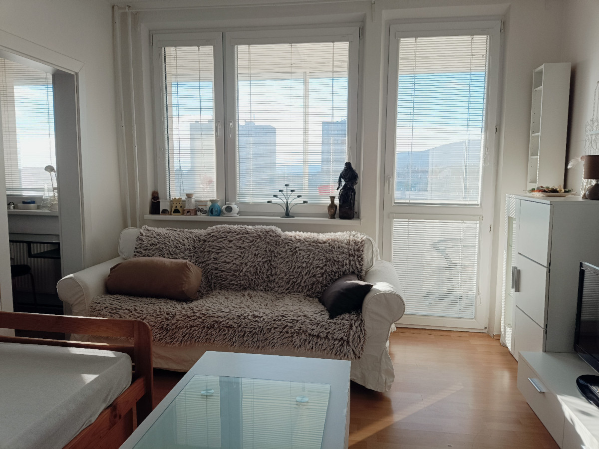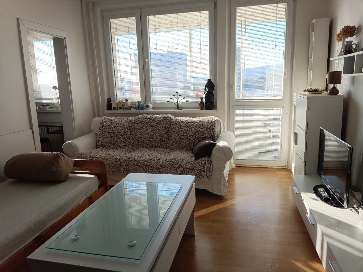 Ponúkam na prenájom slnečný 1-izbový byt v panelovej budove s výťahom na 5. poschodí z 6. Celková plocha bytu je 34 m2 + 6m2 loggia. Byt je zariadený s možnosťou nasťahovať sa ihneď. Nie sme RK.