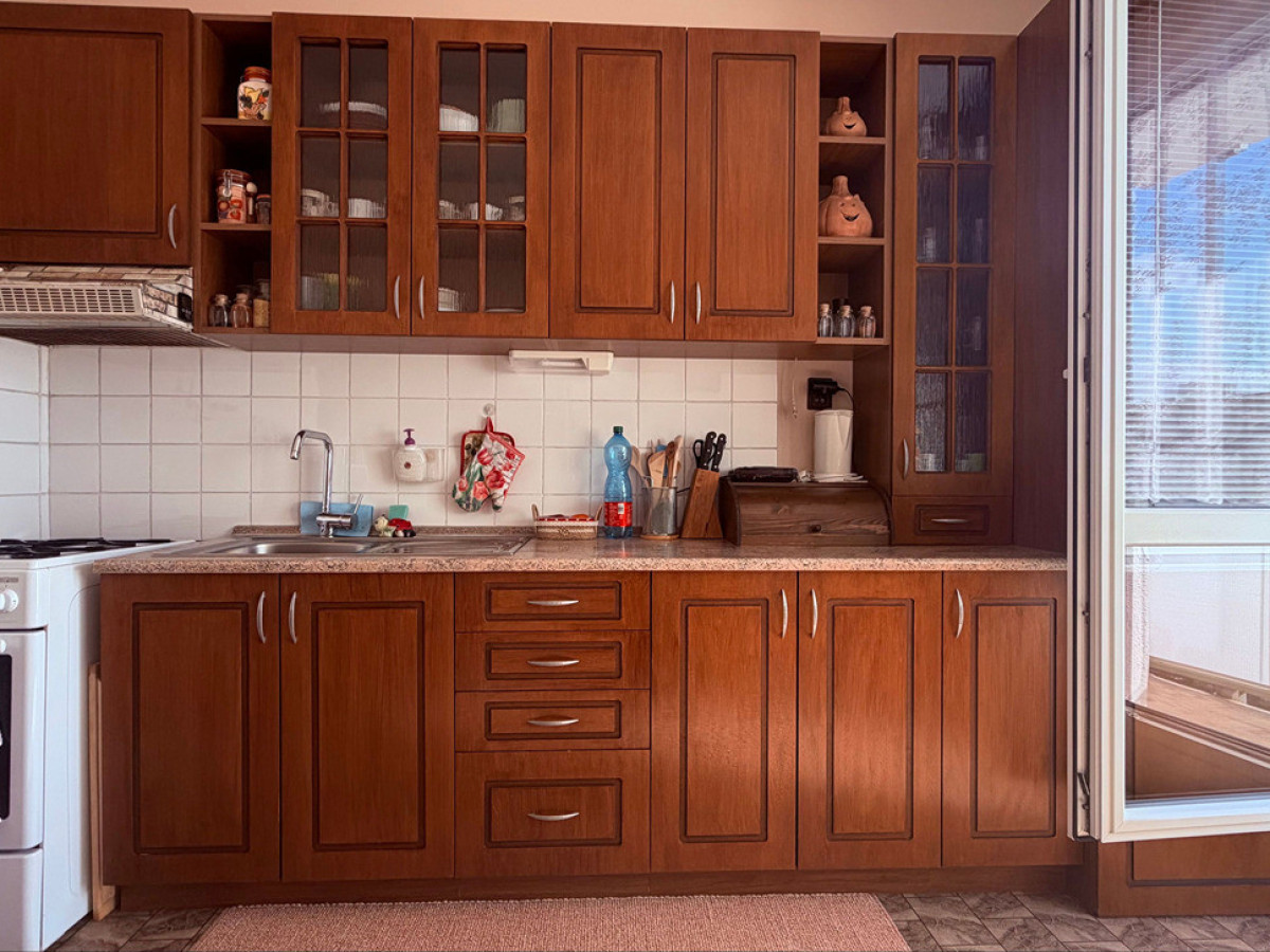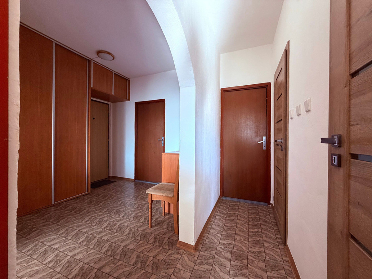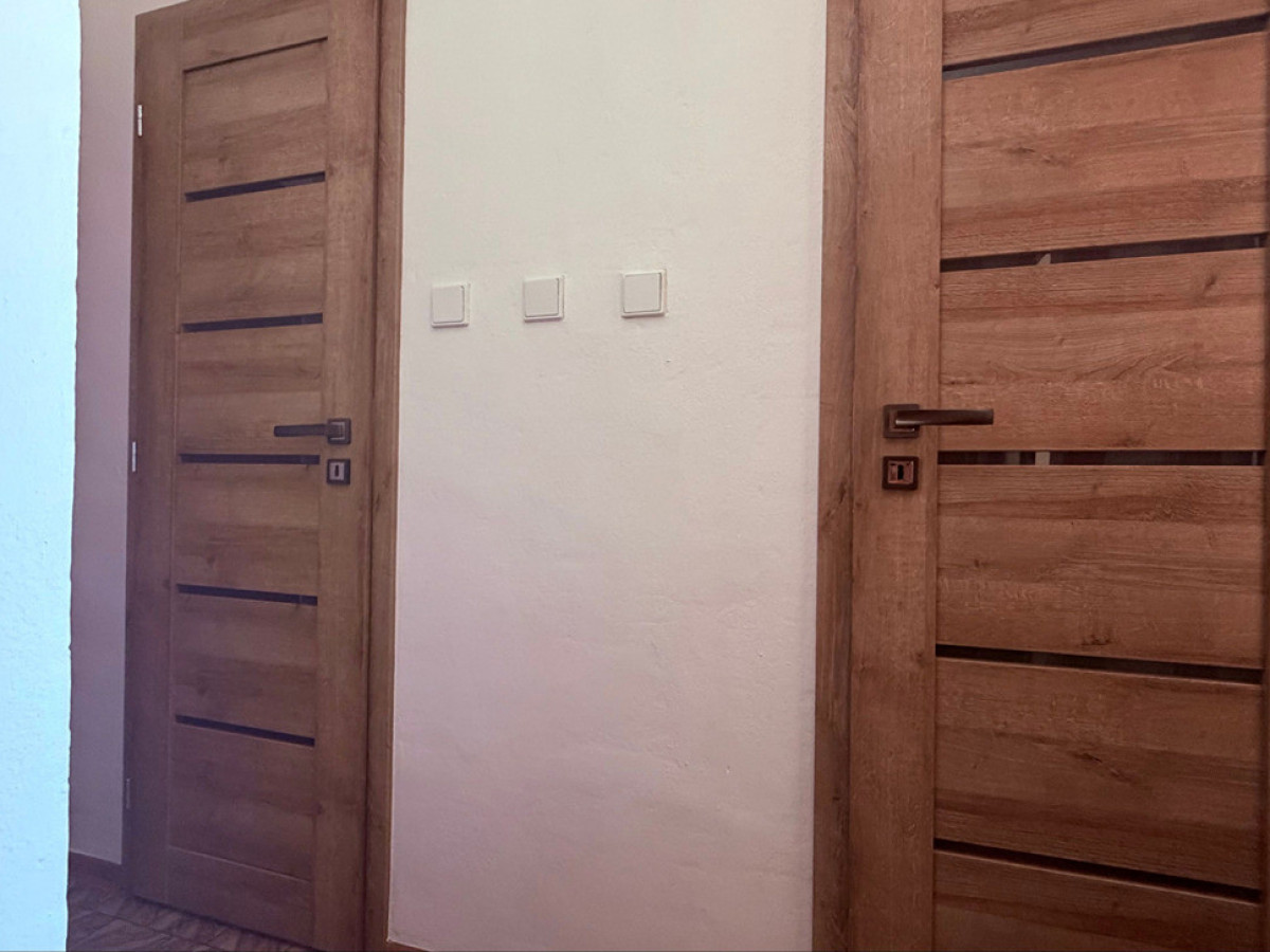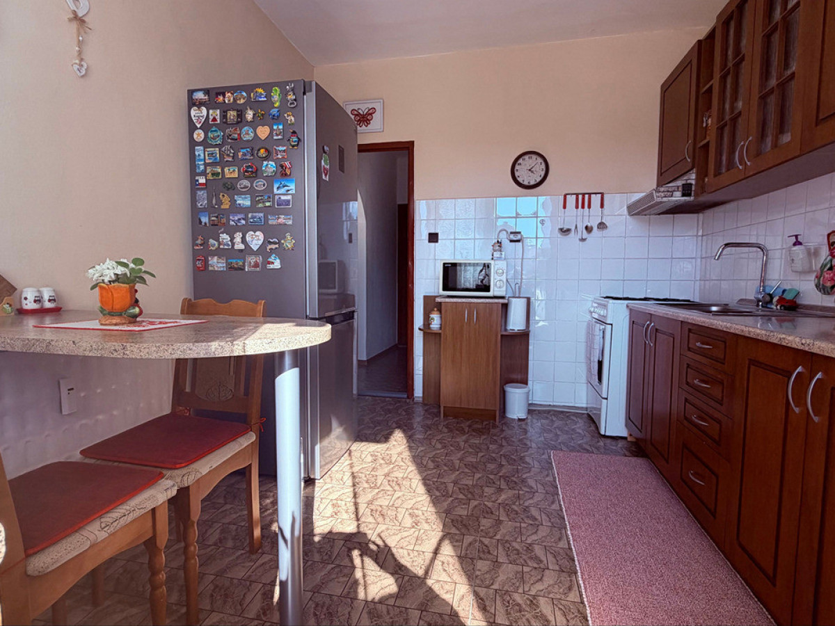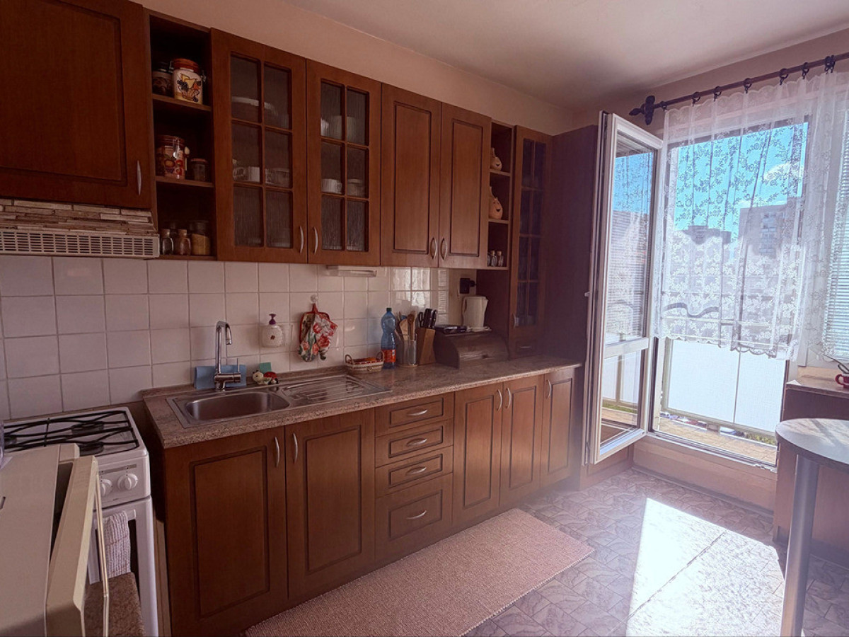 V byte je dostatok úložného priestoru: 3x vstavené skrine v chodbe, spálni a detskej, ktoré boli robené postupne nedávno cca 3 roky dozadu. Pred pár mesiacmi sa komplet rekonštruovala kúpeľňa s WC, osobitne je WC - geberit, kúpeľňa je s murovaným priestranným kútom so zasklením. Menili sa aj nové dvere na WC a kúpeľni, ktoré sú vkusné, ostatné dvere sú pôvodné, ale zato vo veľmi dobrom stave. Kuchynská linka je zánovná (drevo masív), varenie je na plyne. Kúrenie je ústredné s meračmi tepla na radiátoroch. Okná v celom byte sú plastové biele so žalúziami a sieťkami proti hmyzu. V byte sú stierky v dobrom stave. Čo sa týka podláh tak v izbách sú koberce pod nimi linoleum, chodba a kuchyňa linoleum.