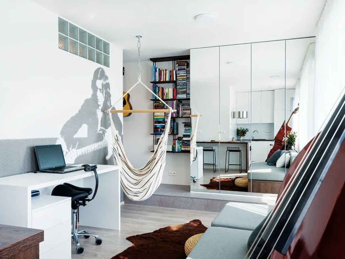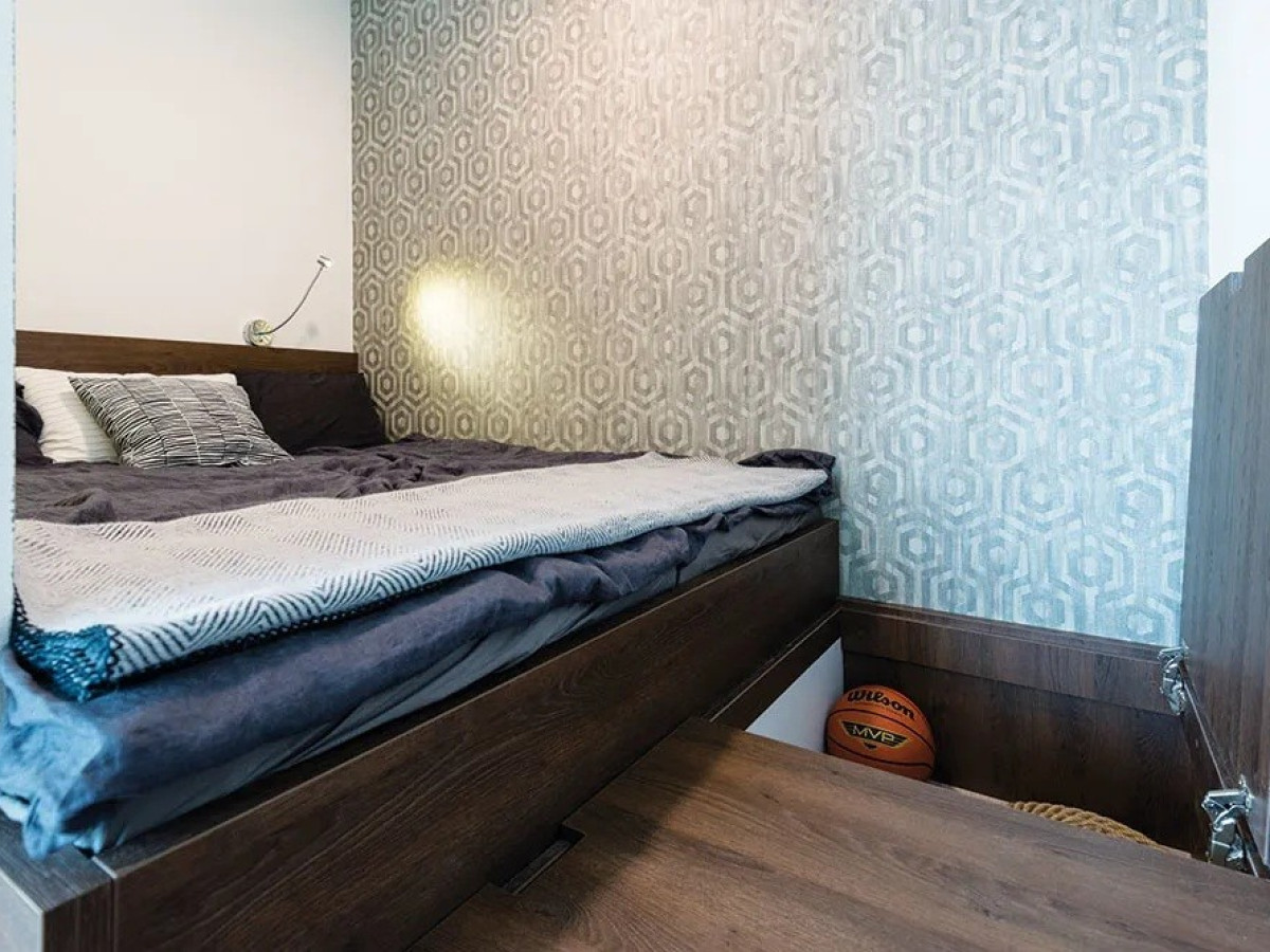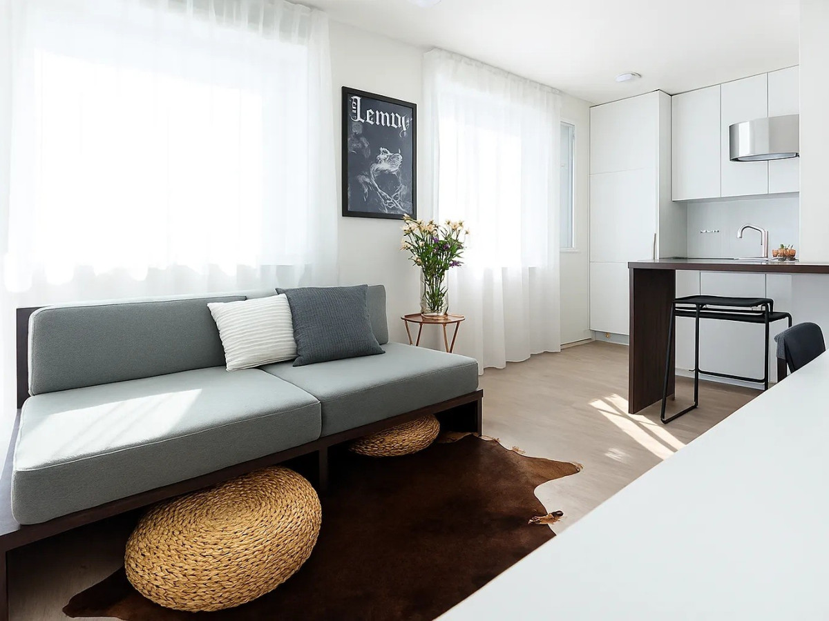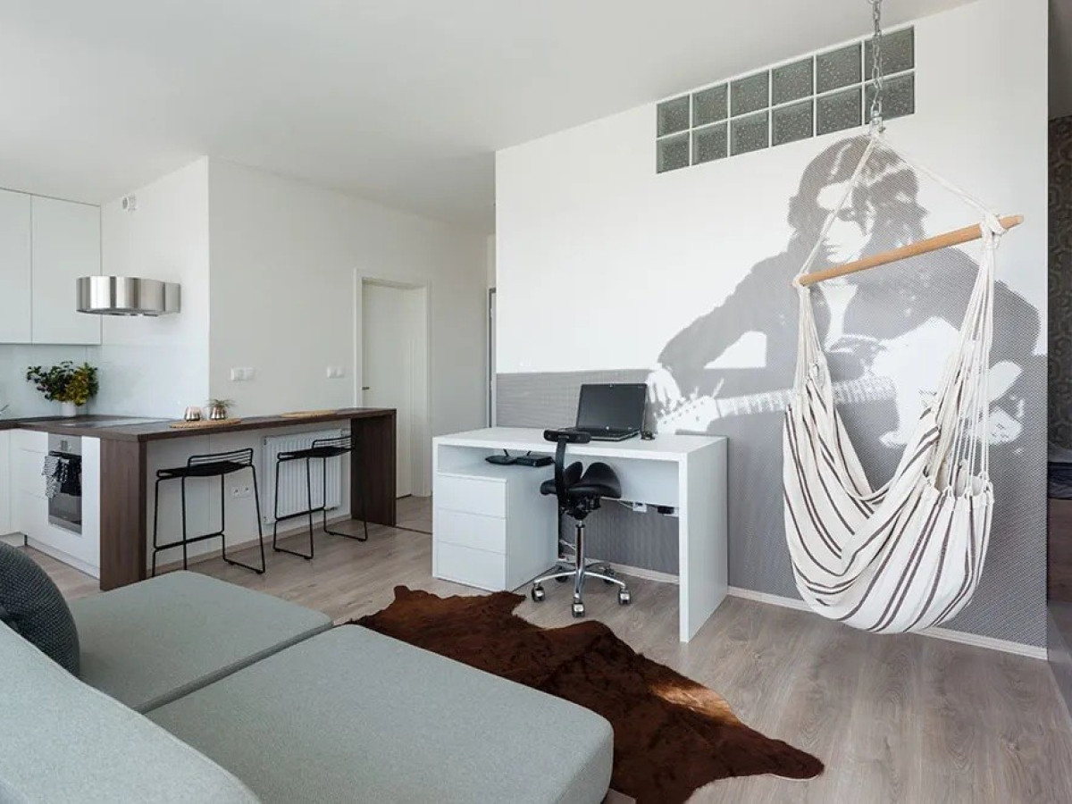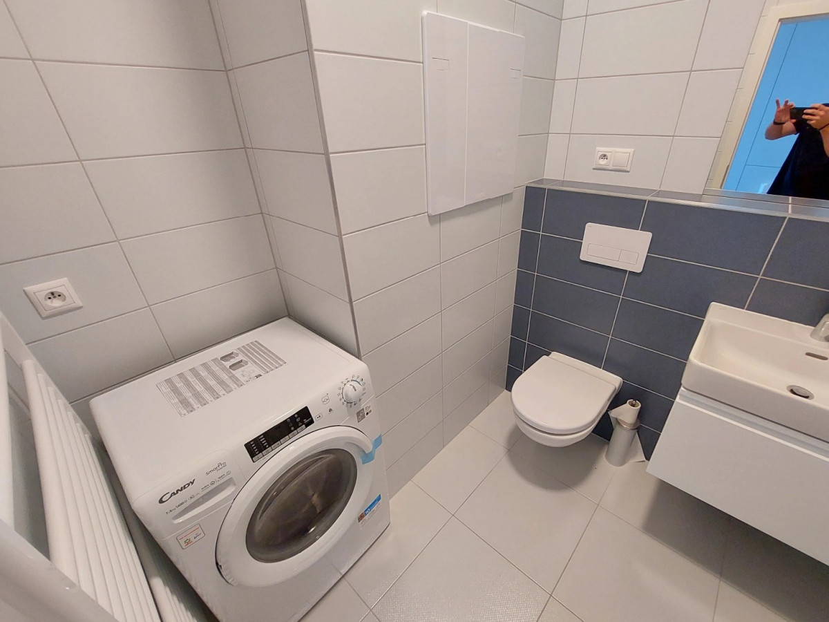 Vybavenie: rohová kuchynská linka so vstavanými spotrebičmi, barový stolík, kúpeľňa s vaňou a závesným WC, práčka so sušičkou, smart TV, bezpečnostné dvere