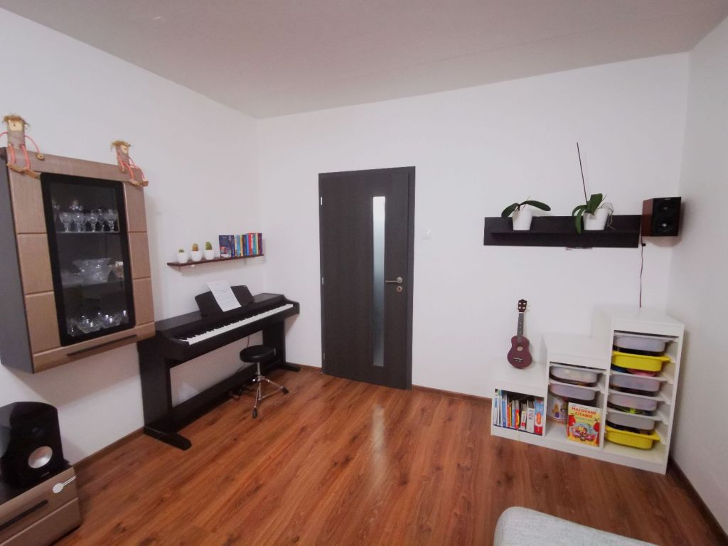 Vstupná chodba s úložným priestorom, kúpeľňa s vaňou, samostatná toaleta, kuchyňa so vstupom na loggiu, samostatná komora, obývačka, spálňa, izba, pivnica na prízemí bytového domu. Všetky izby sú nepriechodzie. Byt je zateplený.