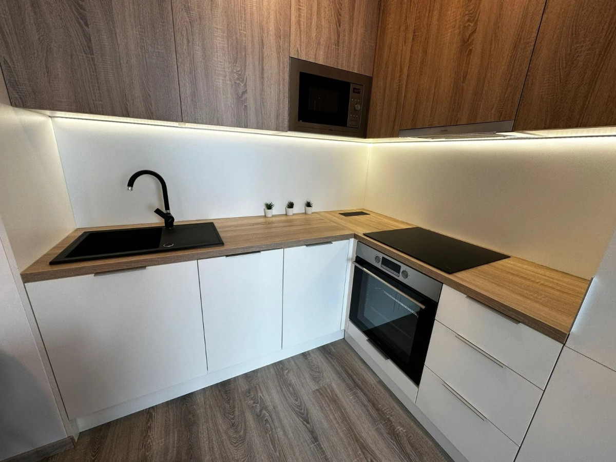 Kuchyňa je vyrobená na mieru s LED podsvietením a vybavená vstavanými spotrebičmi značiek Mora / Gorenje: