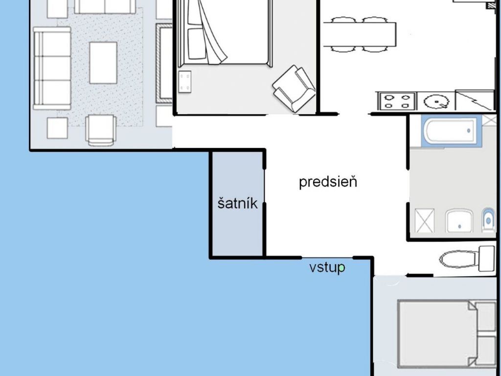 kuchyňa, 1x kúpeľňa (sprchový kút a vaňa) + WC,