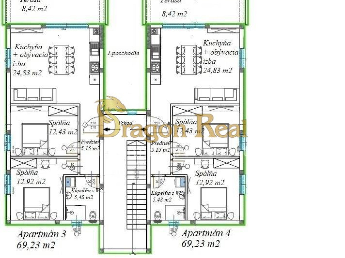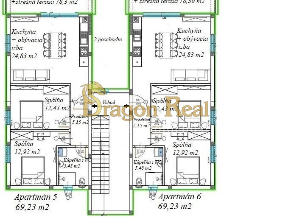 • Apartmány na 2. poschodí majú k dispozícii terasu na streche prislúchajúcu ku každému bytu.