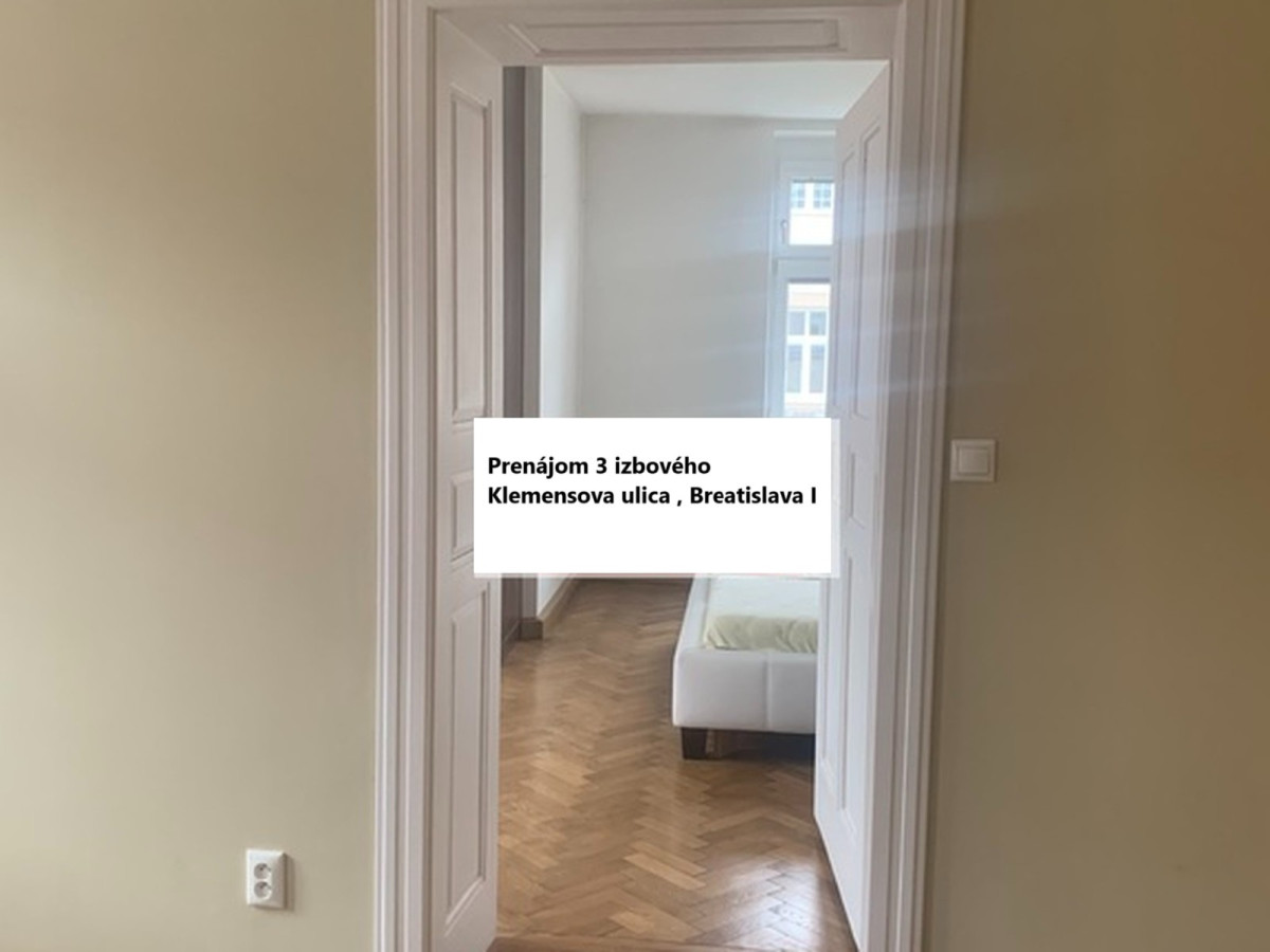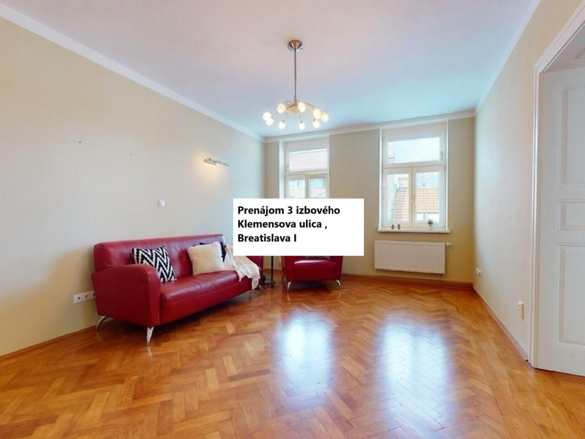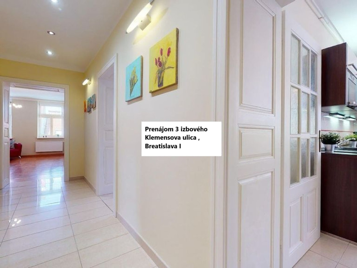 Prenájom 3 izbový byt Klemensovej ul.v Bratislave - Staré Mesto , čiastočne zariadený, úžitková plocha 103 m2, nachádza sa na 4.poschodí/5, bez výťahu, čiastočne zariadený, samostaný vstup do izieb a kuchyne. Voľný ihneď. Cena prenájmu: 1.050 eur/mesacne + 100 Eur za energie. Ponuka je cez RK