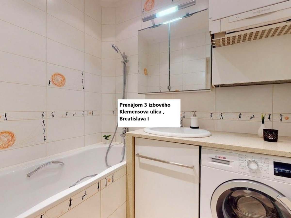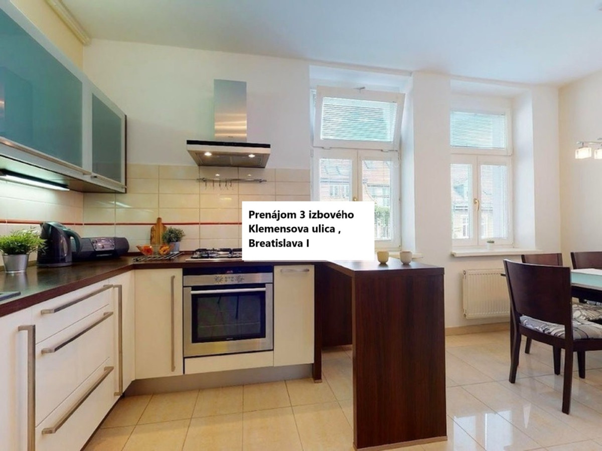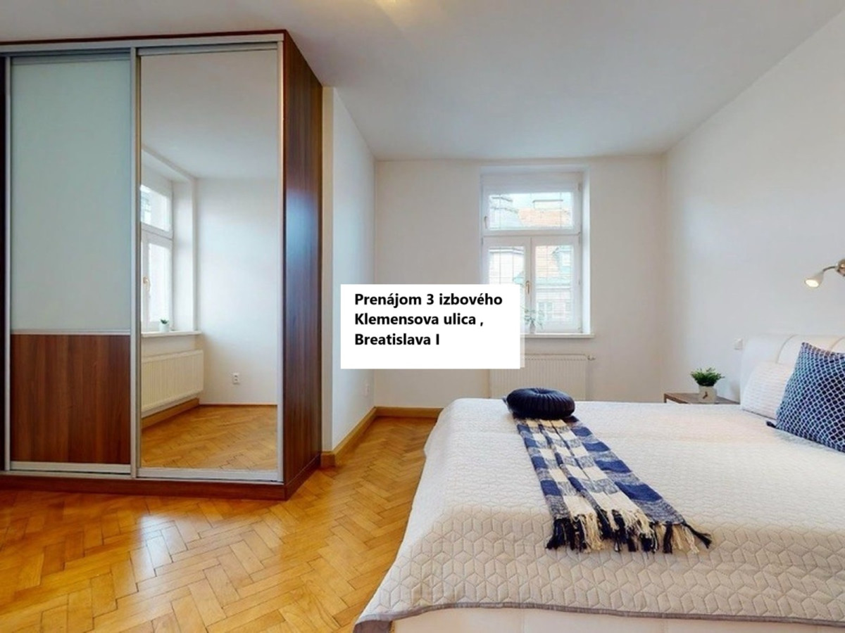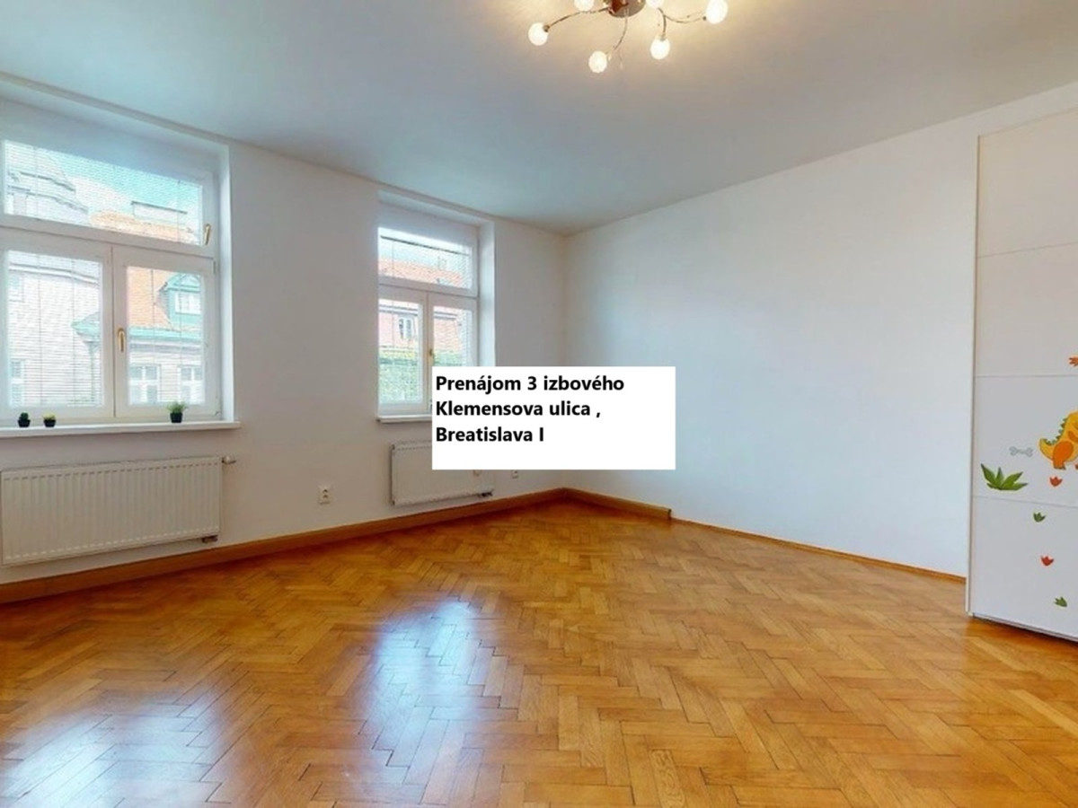 Prenájom 3 izbový byt Klemensovej ul.v Bratislave - Staré Mesto , čiastočne zariadený, úžitková plocha 103 m2, nachádza sa na 4.poschodí/5, bez výťahu, čiastočne zariadený, samostaný vstup do izieb a kuchyne. Voľný ihneď. Cena prenájmu: 1.050 eur/mesacne + 100 Eur za energie. Ponuka je cez RK