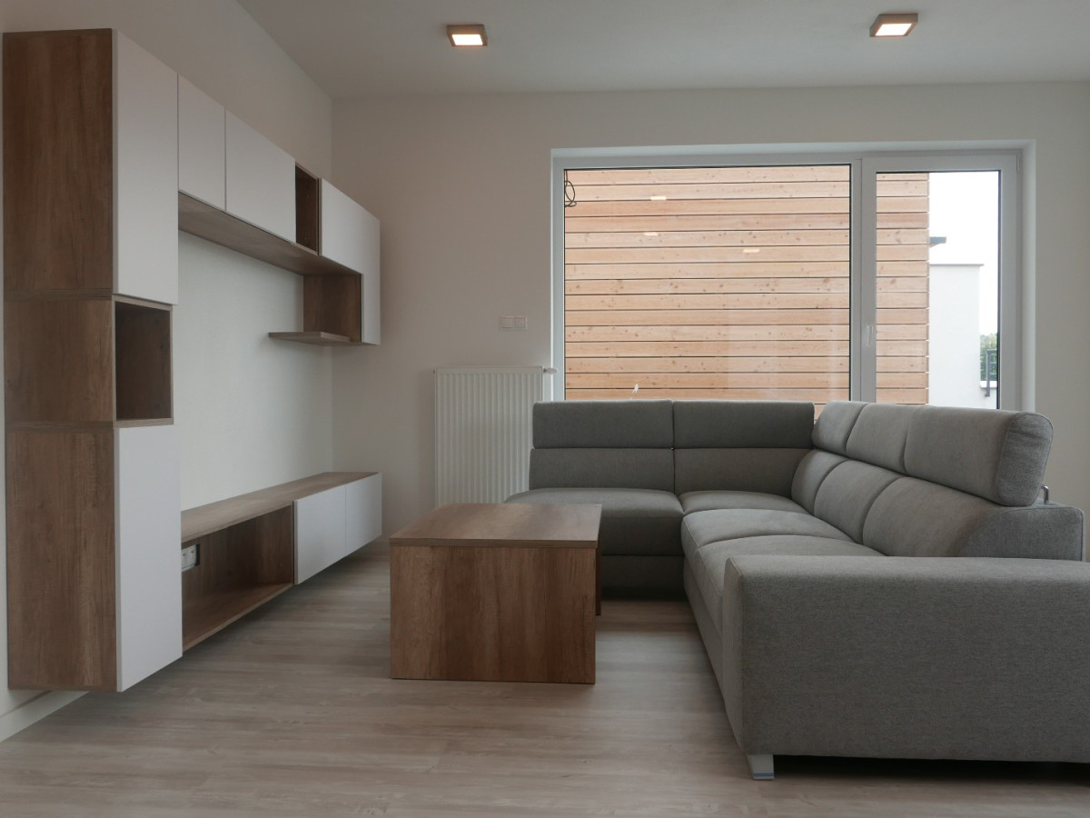 Obývacia izba: pohodlný L-gauč, obývacia stena