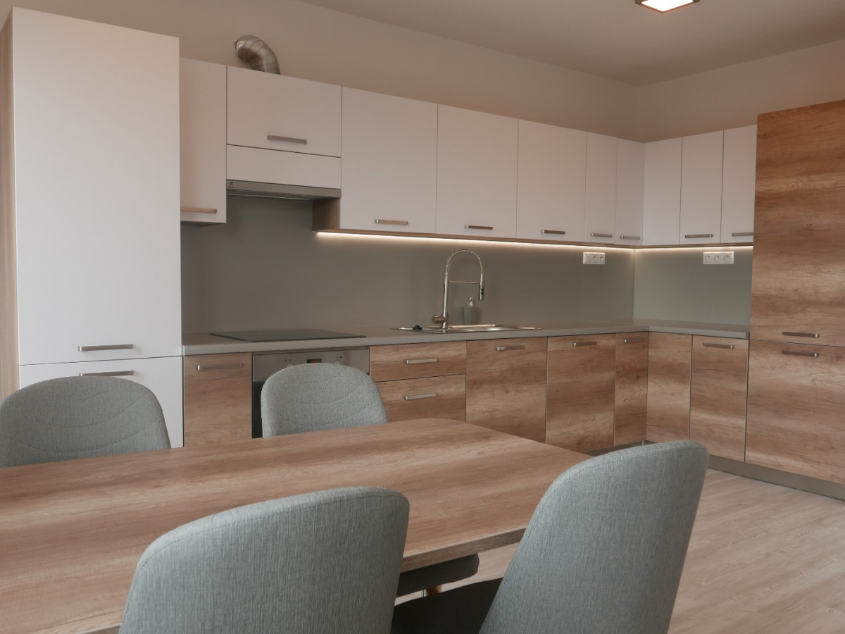Plne vybavená kuchyňa: indukčná varná doska, teplovzdušná rúra, digestor, umývačka riadu, vstavaná chladnička s mrazničkou