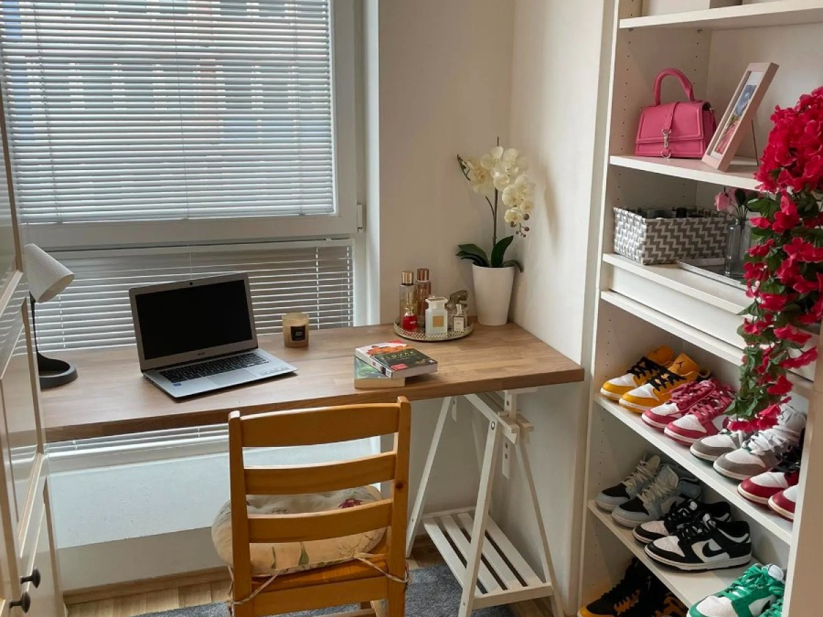 Rozkladacia posteľ, skriňa, vešiak, pracovný stôl, poličky (ideálne pre home office)