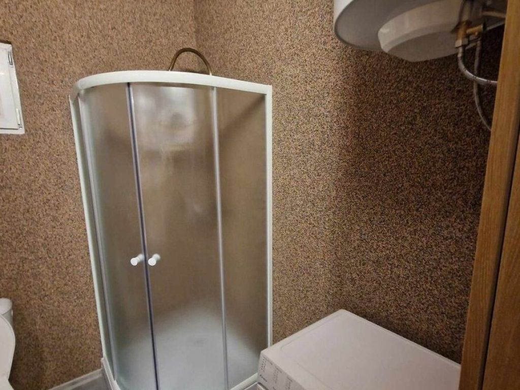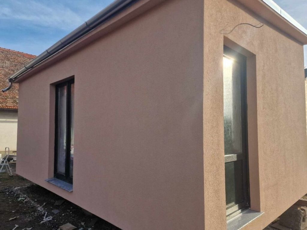 Dům 1kk - modulární dřevostavba 6,5 x 4m, pultová střecha, celoroční ( izolovaný ), venkovní ostění polystyren ( točená omítka - barvu lze vybrat ), vnitřní ostění štukový sádrokarton a malba řecká batika, plastová okna ( německá výroba ), 2 x okno 90x90cm, dvoukřídlé balkonové dveře 130x210cm, okno v koupelně 50x50cm. Dům má obývací prostor cca 4,1 x 3,6m, chodba 1,2 x 1,8m, koupelna 2 x 1,8m. Podlaha v domě je izolovaná a horní vrstva litá a je instalováno podlahové topení s termostatem, který lze ovládat i přes WIFI připojení. Podlahovou krytinou je linoleum v komerční zátěži a je olištováno. Kuchyňská linka je rohová včetně sporáku a odsavače s osvětlením. Mezi kuchyňskou linkou je stěrková batika. Dřez nerez kulatý s pákovou baterií. Osvětlení domu tvoří nástěnné lampy, osvětlení odsavače, stropní světlo - borová pálená fošna, v koupelně osvětlená galerka, nástěnné diodové světlo. Dveře do koupelny jsou rámové - obložkové zárubně. V koupelně na podlaze je keramická dlažba s dekorem, ostění je marmolit a finální točená omítka, sprchový kout 90cm, retro baterie s horní a ruční sprchou, bojler 80L eco, pračka s předním plněním, umyvadlo se skříňkou 85cm, zrcadlo se skříňkou a osvětlením + zásuvka, WC kombi, bidetová sprška. Stropy v domě jsou z páleným palubek. Venkovní parapety jsou mramorové. Rozvody elektro v podomítkovým rozvaděčem s proudovým chráničem.