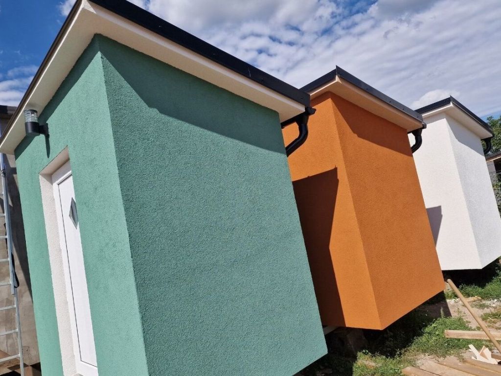 Mobilní koupelna o rozměru 170 x 270cm, keramický obklad, keramická dlažba, sprchový kout, WC kombi, bojler, umyvadlo se skříňkou, zrcadlo, rozvody vody + kanalizace + elektro, plastové dveře, zateplená verze s finální fasádou - lze barvu fasády určit. Koupelna skladem - poslední kus, obvyklá cena je 40 tis vyšší.