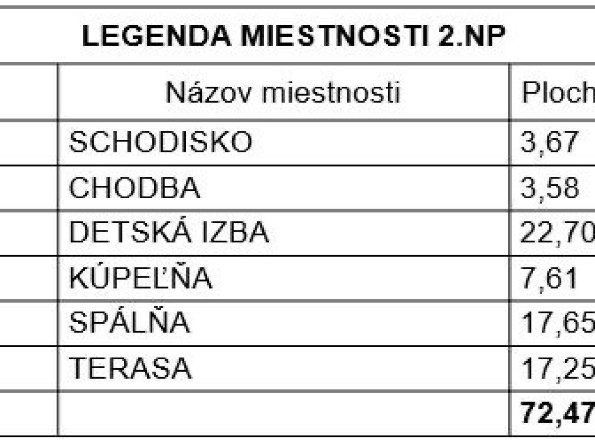 Podkrovie: úžitková plocha -28 m2, chodba -3 m2 , povala -22 m2 , balkón -9,40 m2
