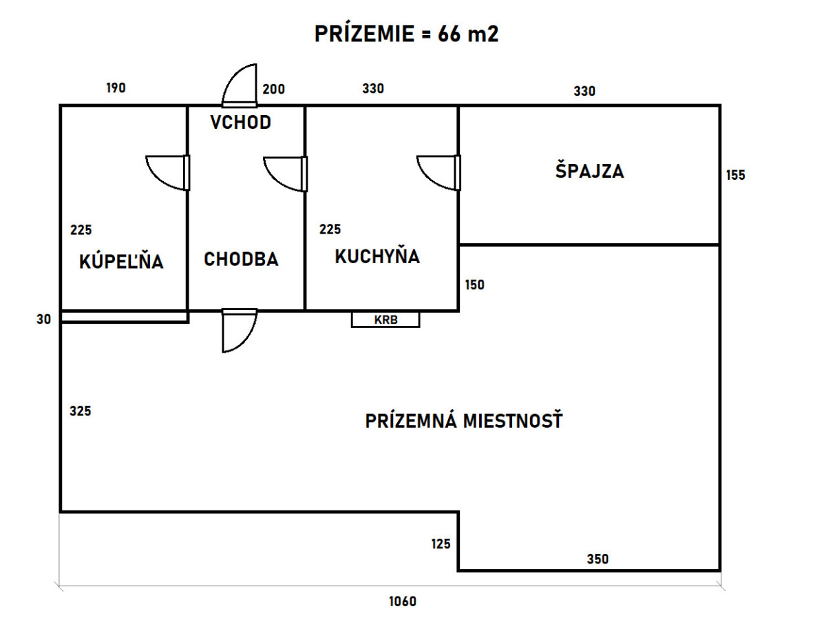 - Prízemie – 66 m2 (chodba vstupná, kúpeľňa s WC, kuchyňa + špajza, priestranná obývačka s krbom)