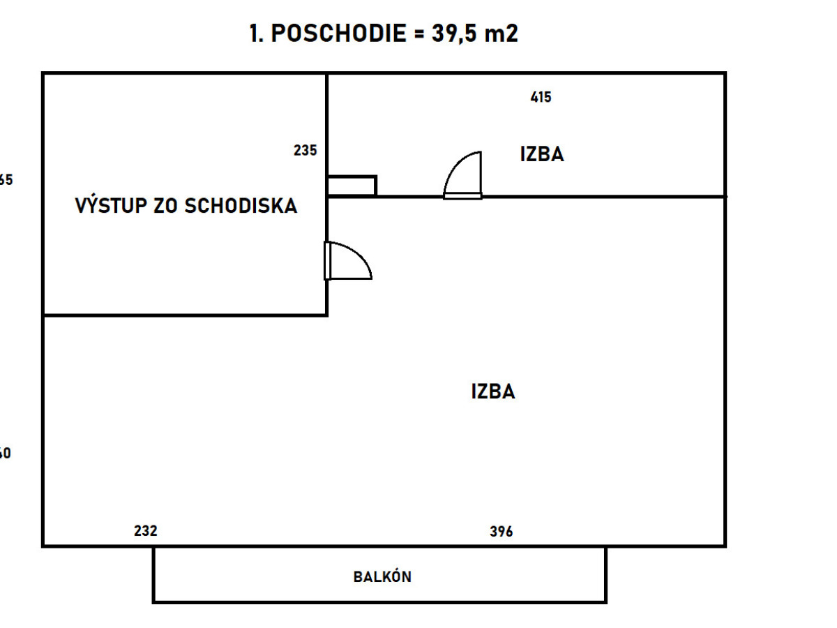 - 1. poschodie – 39,5 m2 (1 veľká izba s výstupom na balkón plus 1 menšia izba, veľká izba je prechodná do menšej)